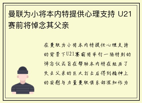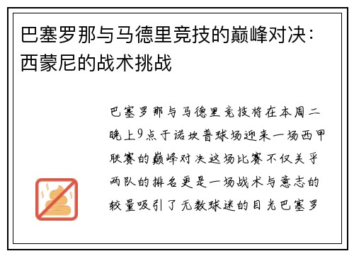 本篇文章将围绕埃梅里解释桑乔短暂上场后再次被换下的情形,阐述其完全基于战术考虑的原因展开深入分析。埃梅里作为一名经验丰富的主教练,其执教风格和战术安排一向充满了精细的计算和灵活的调整。在一次比赛中,桑乔短时间内上场却很快被换下的举动引发了广泛的关注和讨论。埃梅里在赛后对这一决策的解释中明确指出,这一举动并非因为桑乔的个人表现问题,而是出于整体战术的需求和即时比赛中的变化。从战术角度出发,本文将分析...